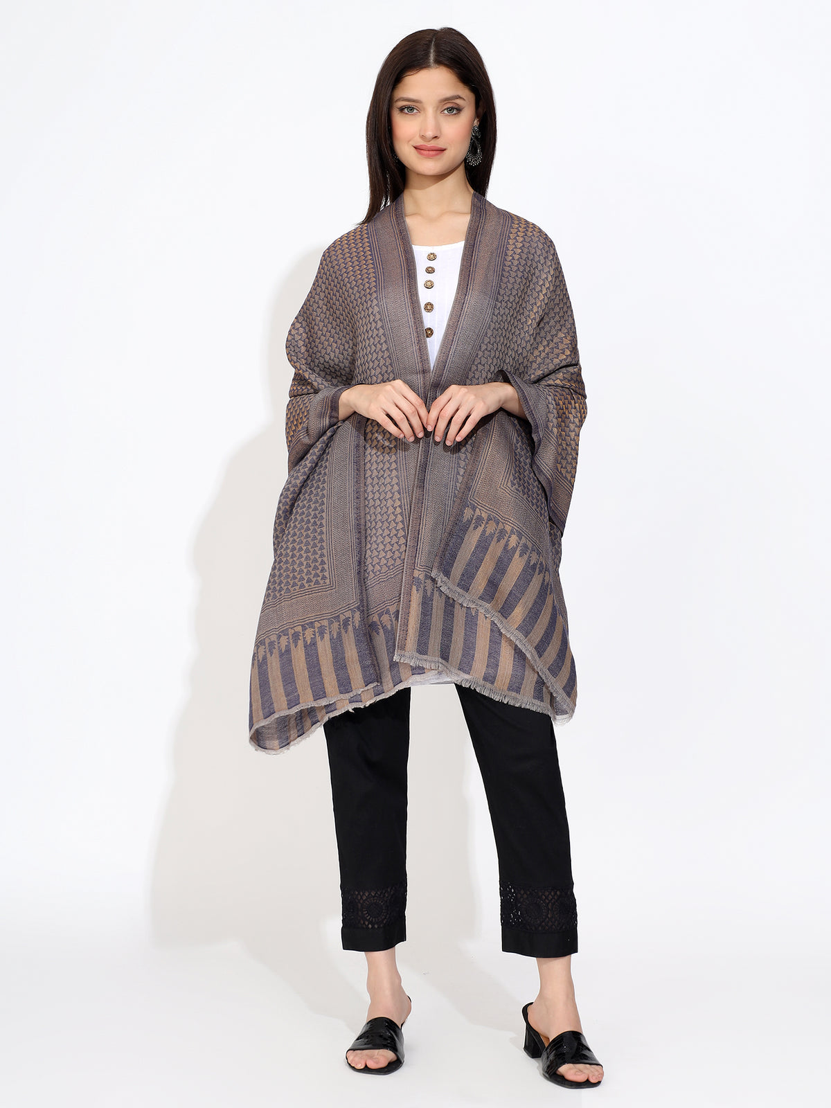 This blue diamond pattern stole gleams with self Zari accents, offering a rich sapphire tone that's endlessly adaptable—from anarkalis to blazers. If you're hunting to buy blue diamond pashmina stole online or craving premium Zari chevron-alternative shawls, its wool-silk fusion promises opulent warmth without bulk.