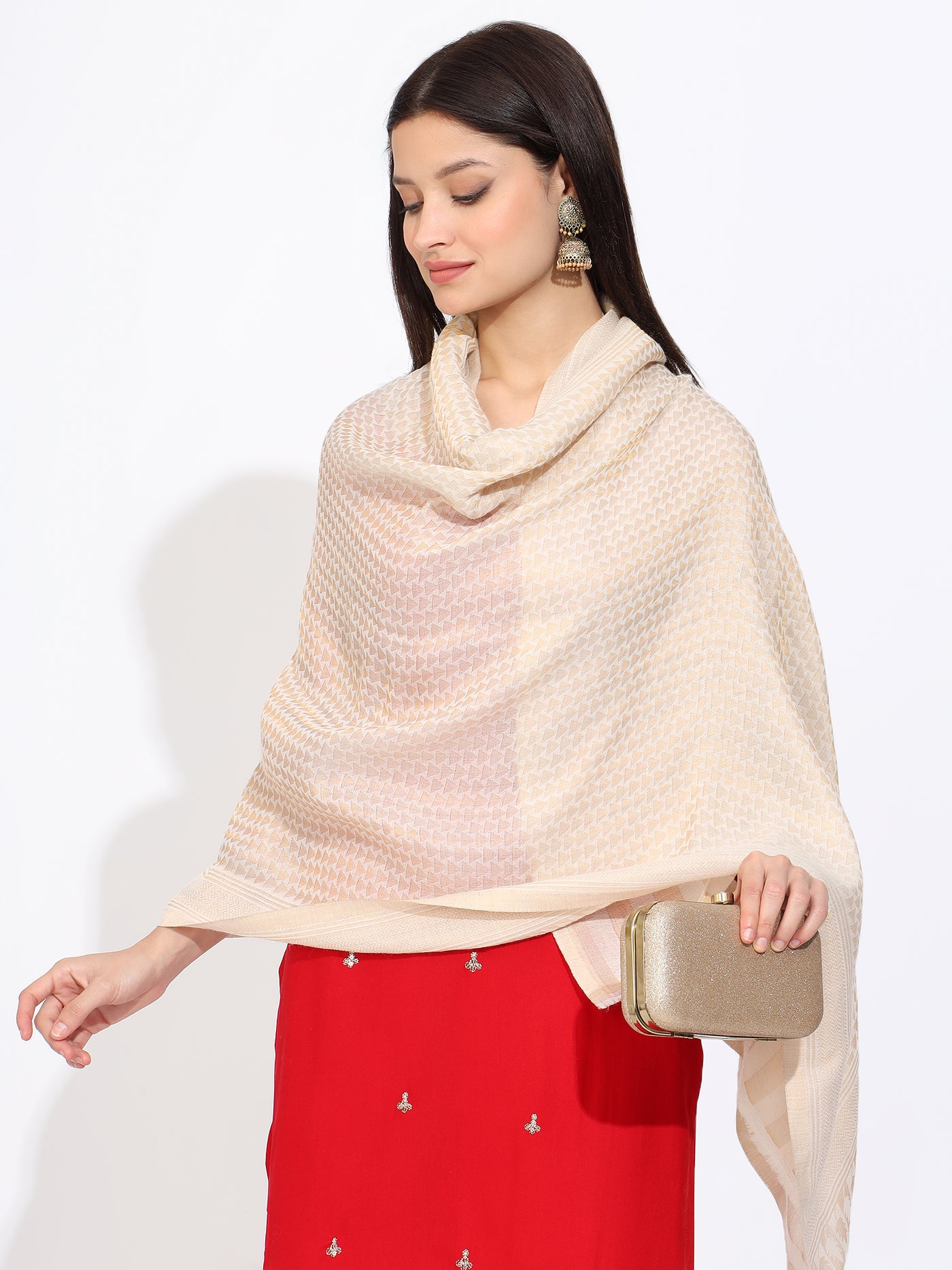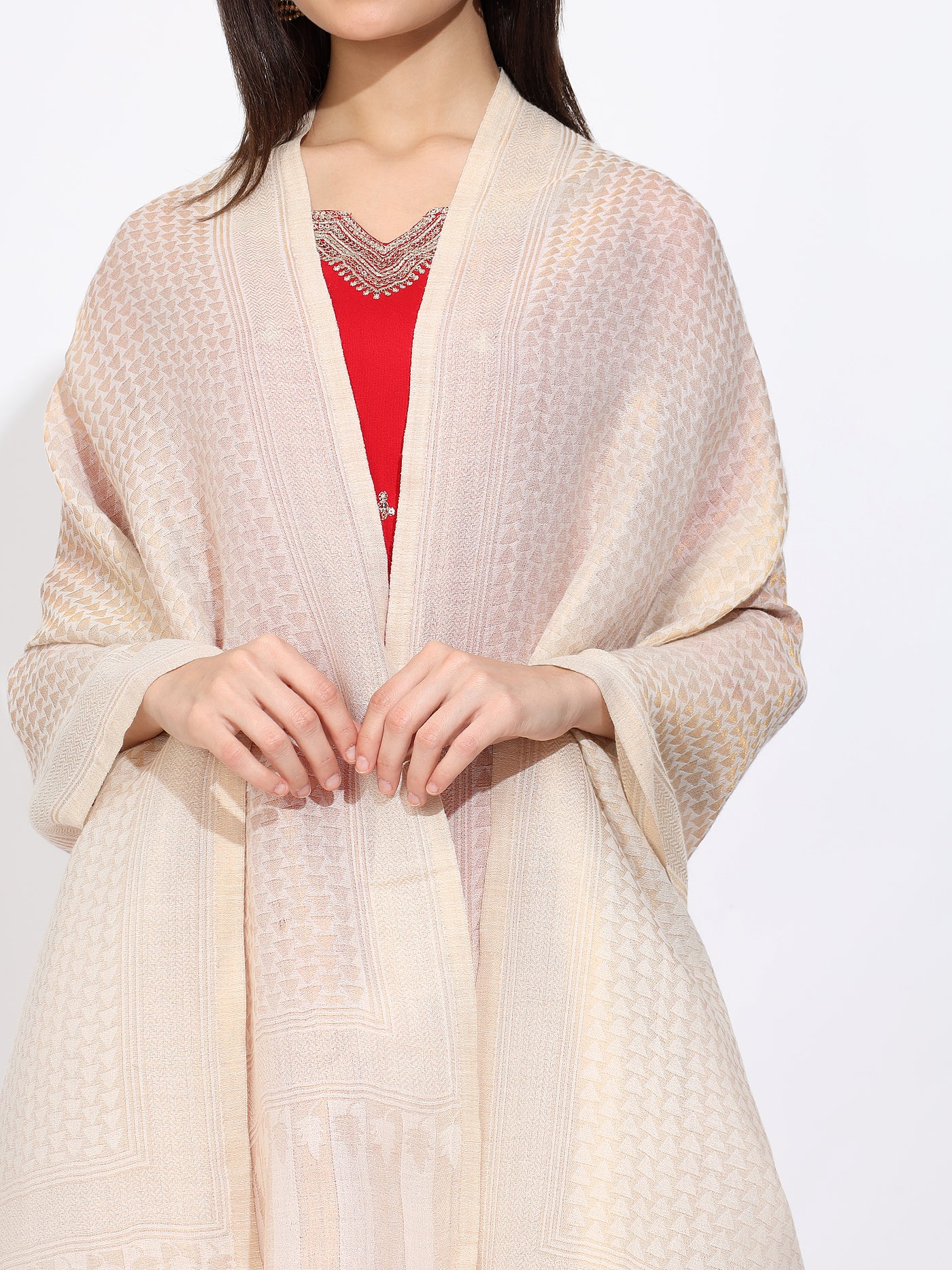 Unveil refined luxury with our Off White Pashmina Stole, showcasing a captivating diamond pattern self Zari design that merges traditional artistry with timeless appeal. Made from the finest pashmina wool, this luxury diamond pashmina shawl offers a soft, lustrous drape perfect for elevating everyday or special occasions. The ultimate off white self Zari stole for those seeking subtle glamour.