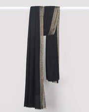 The Black Pashmina Wool Zari Kandi Border Stole is an epitome of class and sophistication. Perfect for formal gatherings, this stole enhances any outfit with its deep black shade and shimmering zari detailing.