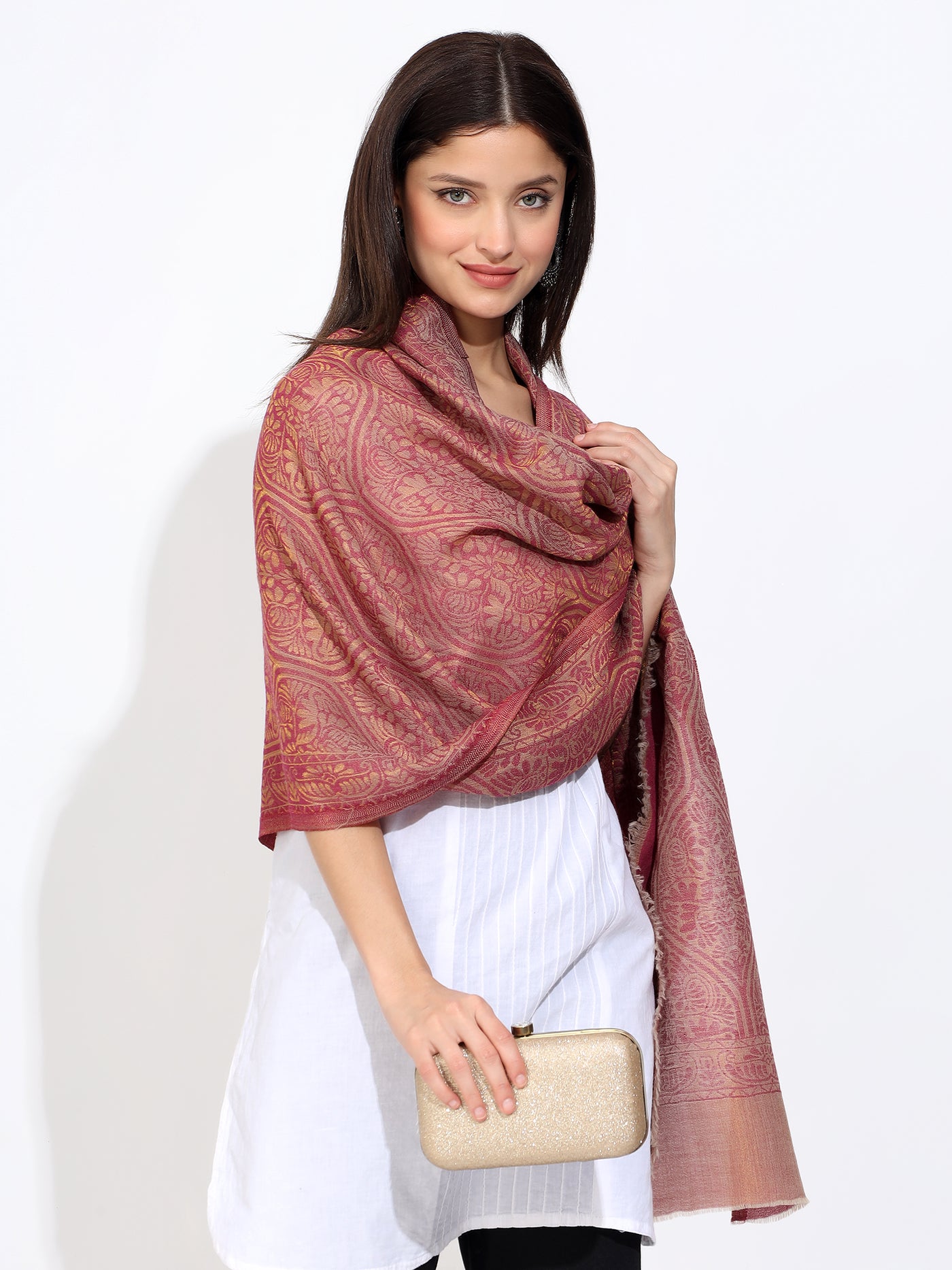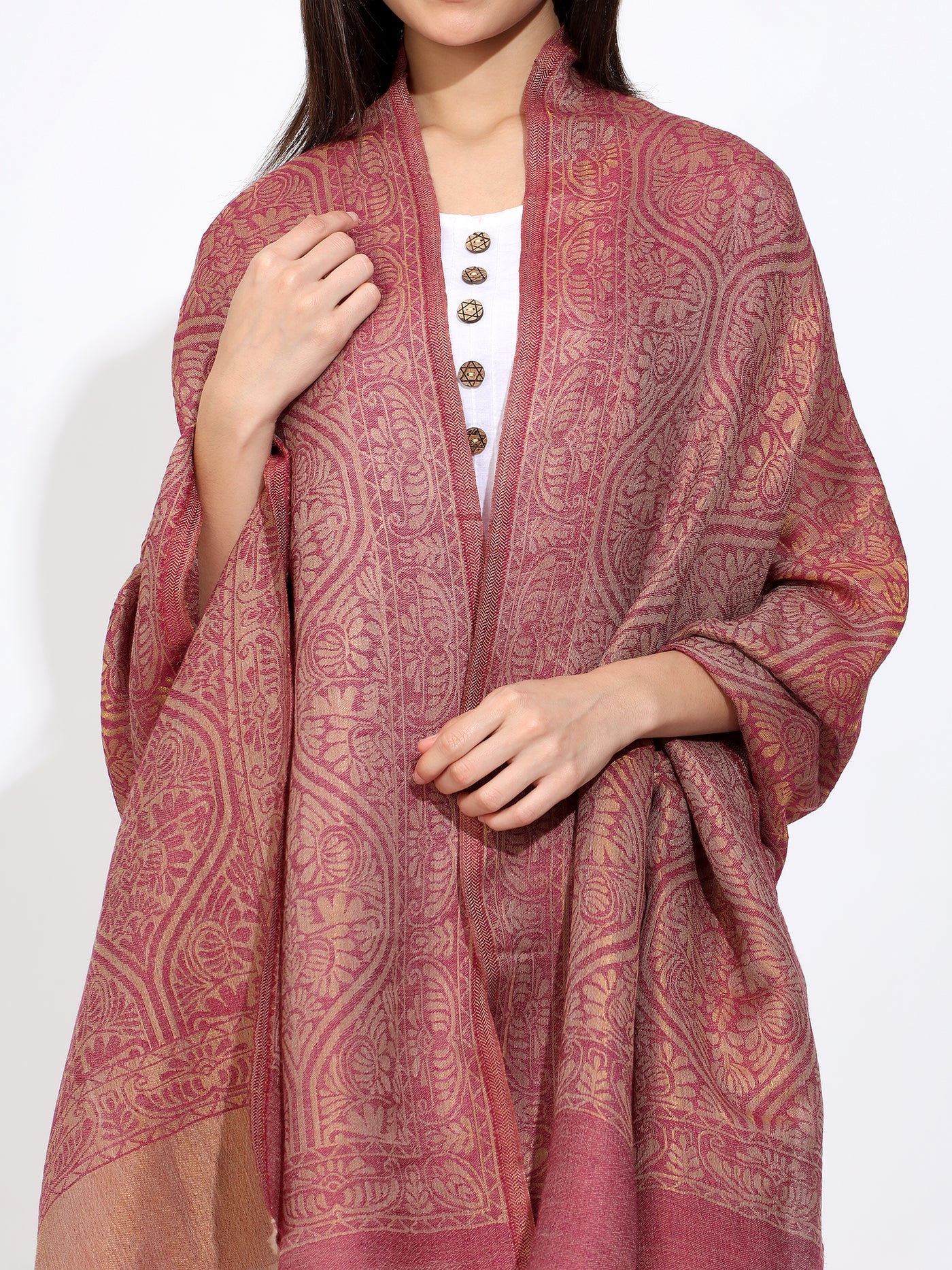 Ideal for both formal and casual occasions., this vibrant red stole, made with the finest pashmina wool and adorned with self zari workadds sophistication to any outfit.