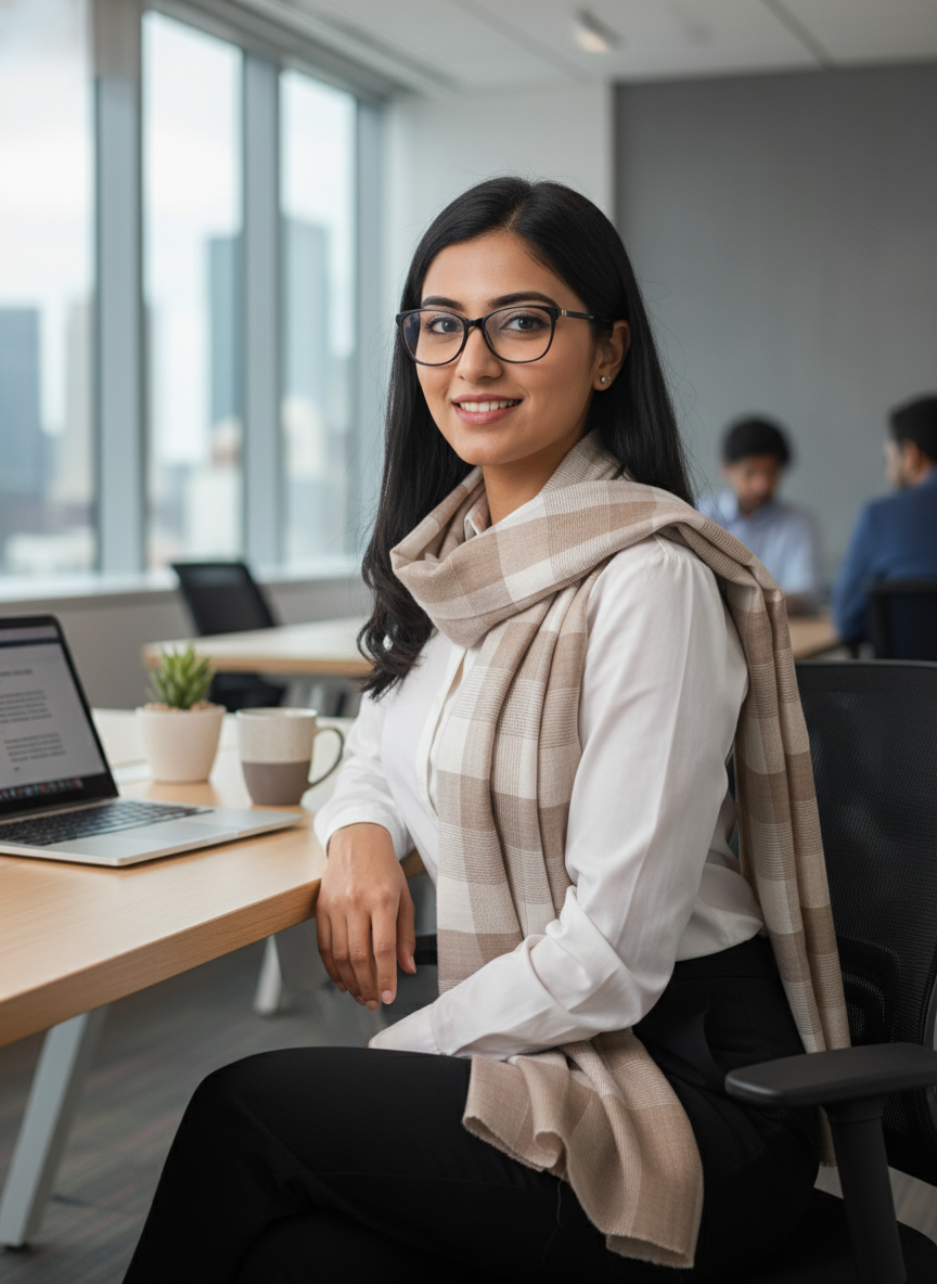 The Cream Pashmina Wool Natural Check Stole adds warmth and style to any outfit, making it a perfect choice for casual and formal wear.