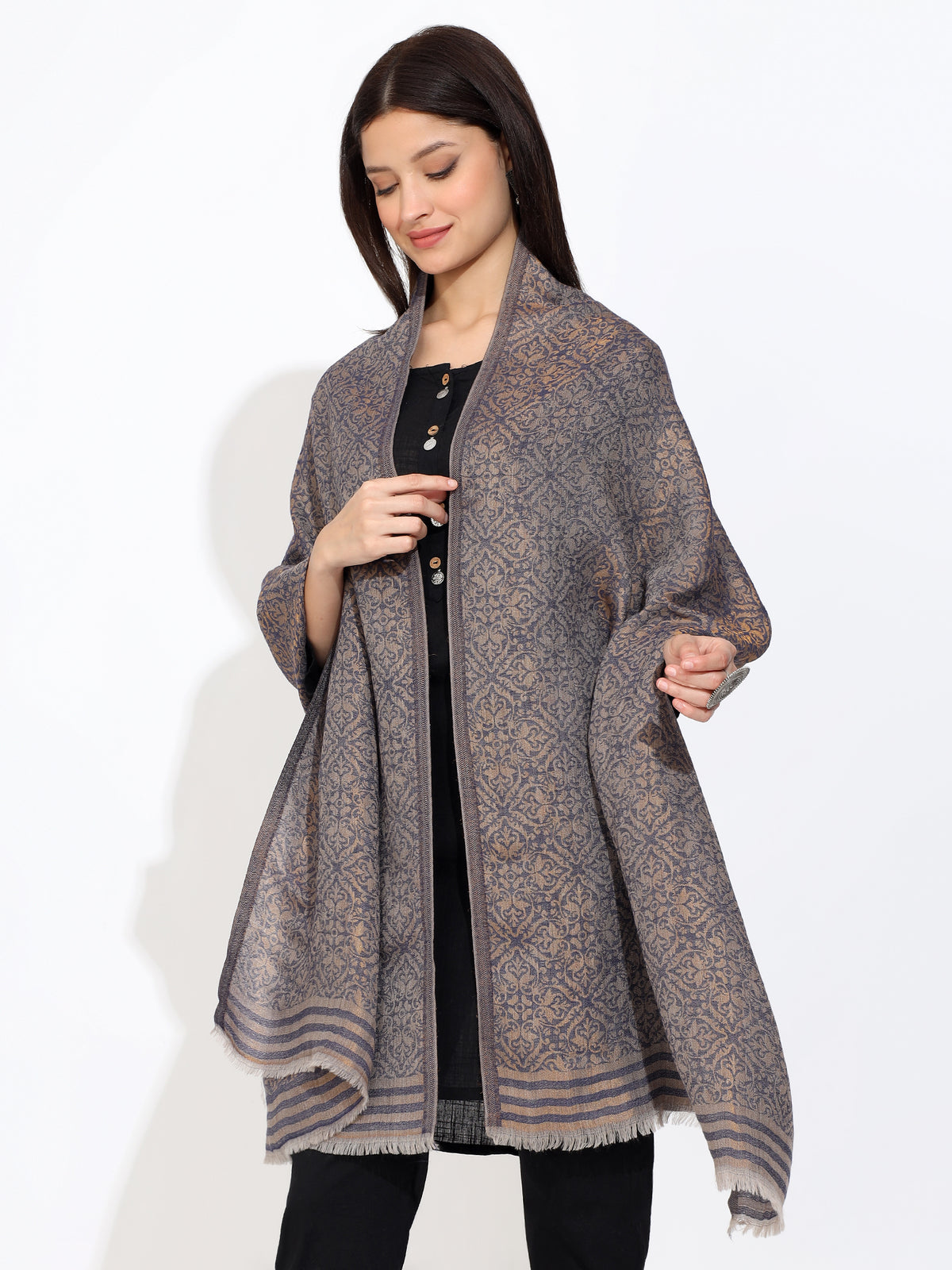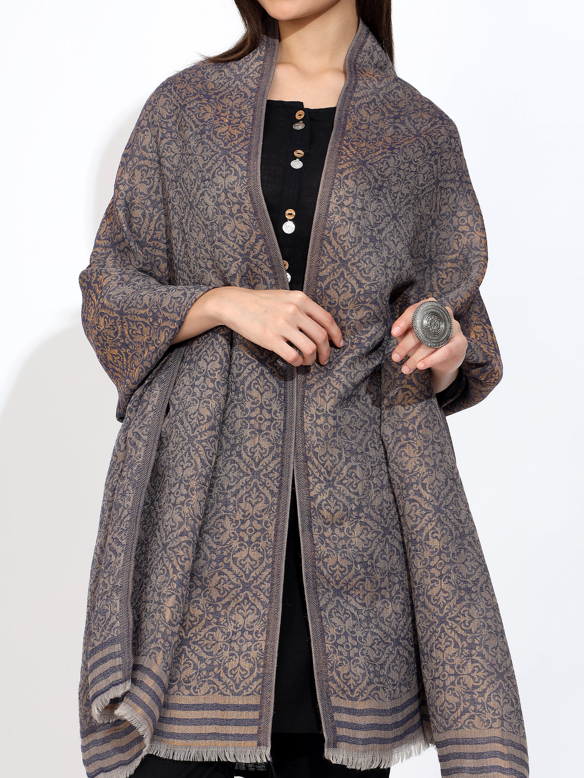 The natural symbiosis of Pashmina wool and fine silk ensures gentle heat retention, while the light as air stole seems almost weightless on your neck. Classic Zari Design in Self Settle-Blue makes it a must-have luxury accessory in your winter wardrobe.